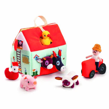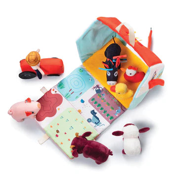 Large enough for easy play but compact enough to take with you to granny's and easy pack up for storage, the Lilliputiens My First Farm is made from beautiful fabrics with individual textures and has a carry handle on top. It is comprised of a barn with an opening door and roof that becomes the farm yard enclosure. Farmer Fon is on his tractor and greets Ignace the donkey, Simon the pig, Rosalie the cow, Yvon the sheep, Paulette the chicken and Gaspard the duck who are the colourful inhabitants of this farm. Machine washable, the farm is easy care and will help toddlers learn their animals and encourage role play at the same time which is great for social development and imagination. Such cheerful hustle and bustle in the farmyard!