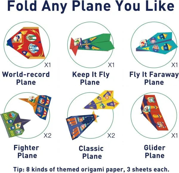 This Airplane Origami set includes 3 pieces of 8 different plane folding sheets, and 12 blank patterns that kids can use to create their own plane.
